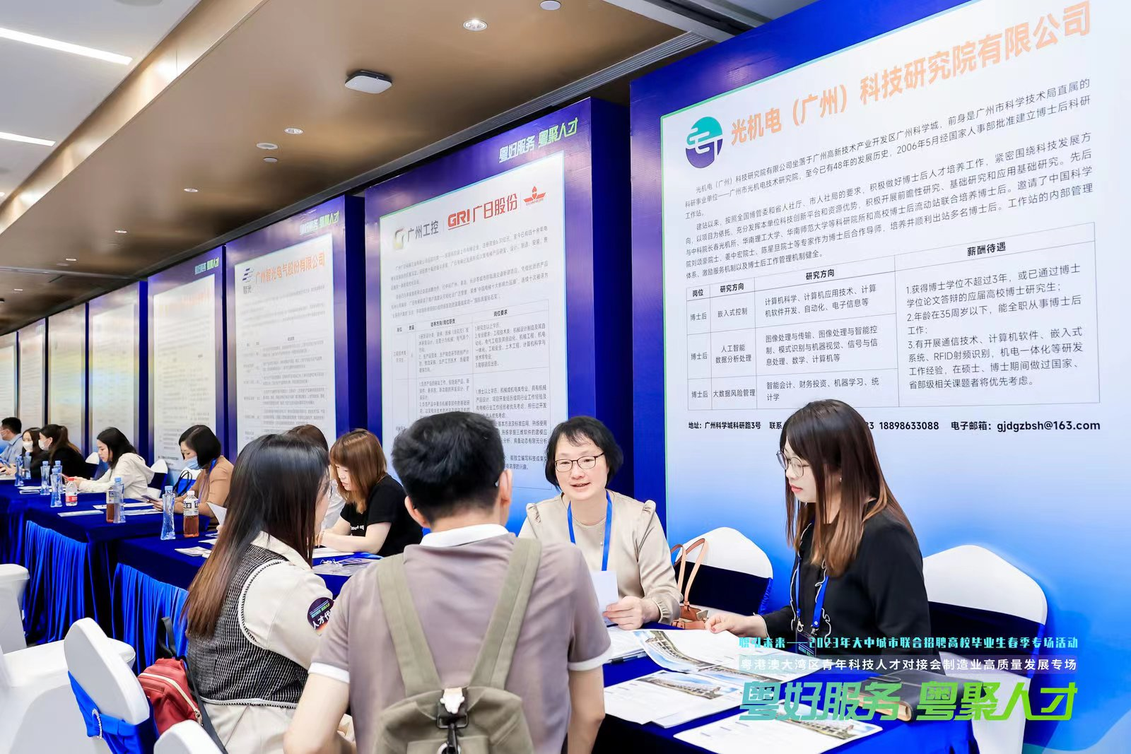 本次活動(dòng)現(xiàn)場設(shè)置了宣講推介區(qū)、引薦洽談區(qū)和政策展示區(qū)。舉辦單位配置的人才服務(wù)專員,精準(zhǔn)高效引薦碩博人才與需求單位開展洽談。楊秋虹副董事長領(lǐng)隊(duì)與前來交流的碩博求職人才進(jìn)行初步洽談,明確公司招聘需求,了解人才情況,進(jìn)行初步意向?qū)印R幻猩酱髮W(xué)應(yīng)屆博士人才的條件基本符合公司進(jìn)站博士后招聘要求,經(jīng)雙方選擇,達(dá)成進(jìn)一步面試意向,并確定于近期內(nèi)該名博士前來公司面試,再行深度溝通。