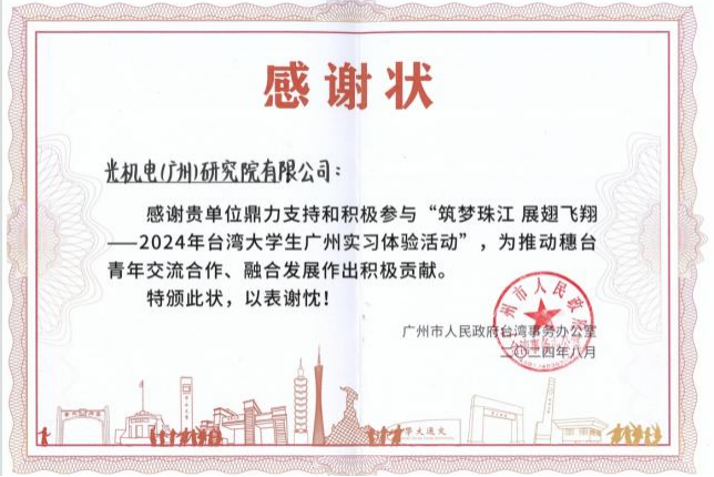 本次活動,光機電獲得來自廣州市臺辦的感謝狀,以表彰光機電在推動穗臺青年交流合作、融合發(fā)展作出積極貢獻(xiàn)。據(jù)統(tǒng)計,光機電已經(jīng)連續(xù)8年作為臺灣大學(xué)生廣州(黃埔)實習(xí)體驗活動承辦單位,并且持續(xù)榮獲市委臺辦、區(qū)統(tǒng)戰(zhàn)部共同頒發(fā)的“優(yōu)質(zhì)服務(wù)獎”榮譽稱號。